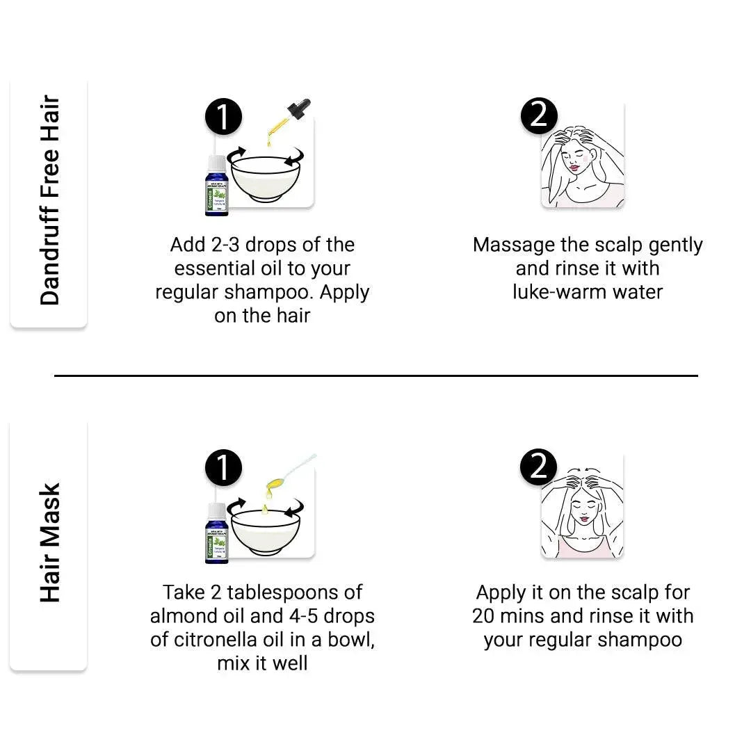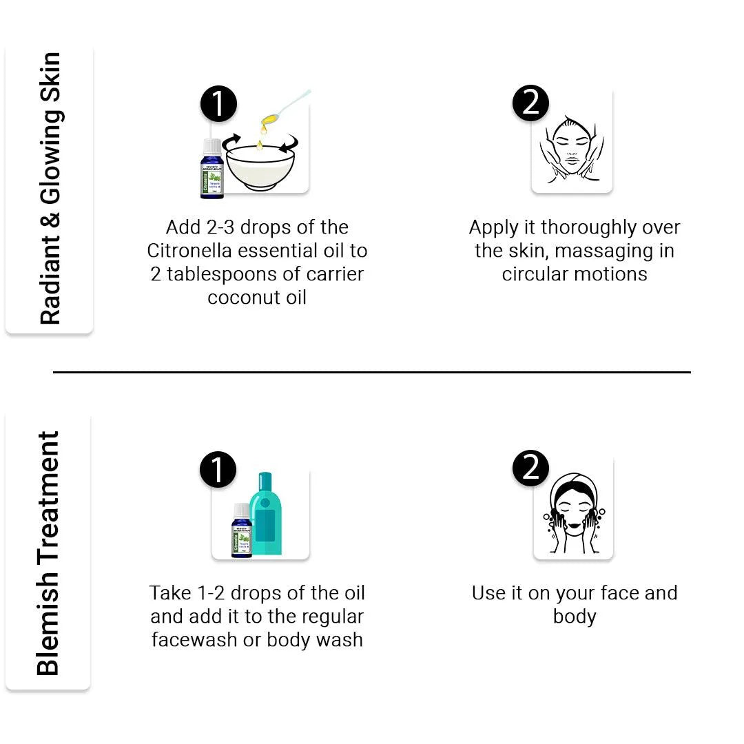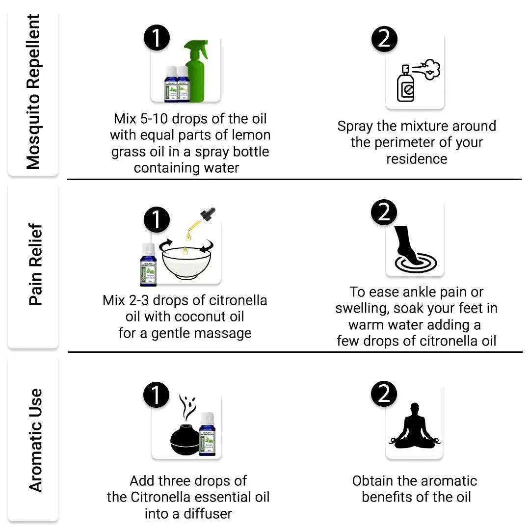 Our Citronella Essential Oil is 100% Pure, Organic, Therapeutic & Steam Distilled; It can be used in diffusers and inhaled directly with 4-5 drops in handkerchiefs for freshness and relaxation.