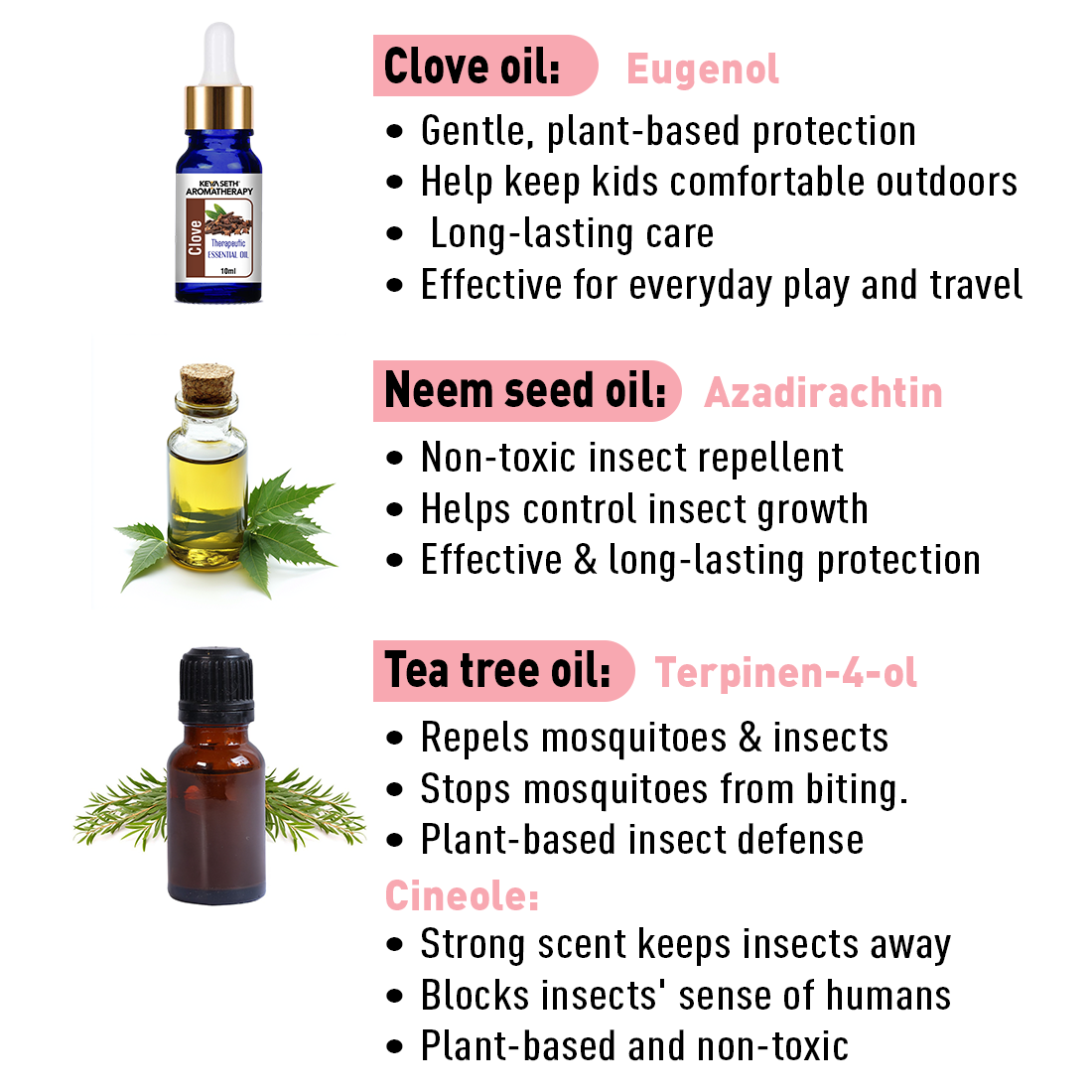 Clove oil acts as a powerful insect deterrent, while neem seed oil, known for its centuries-old protective properties, helps guard against mosquito bites and insect-borne diseases.